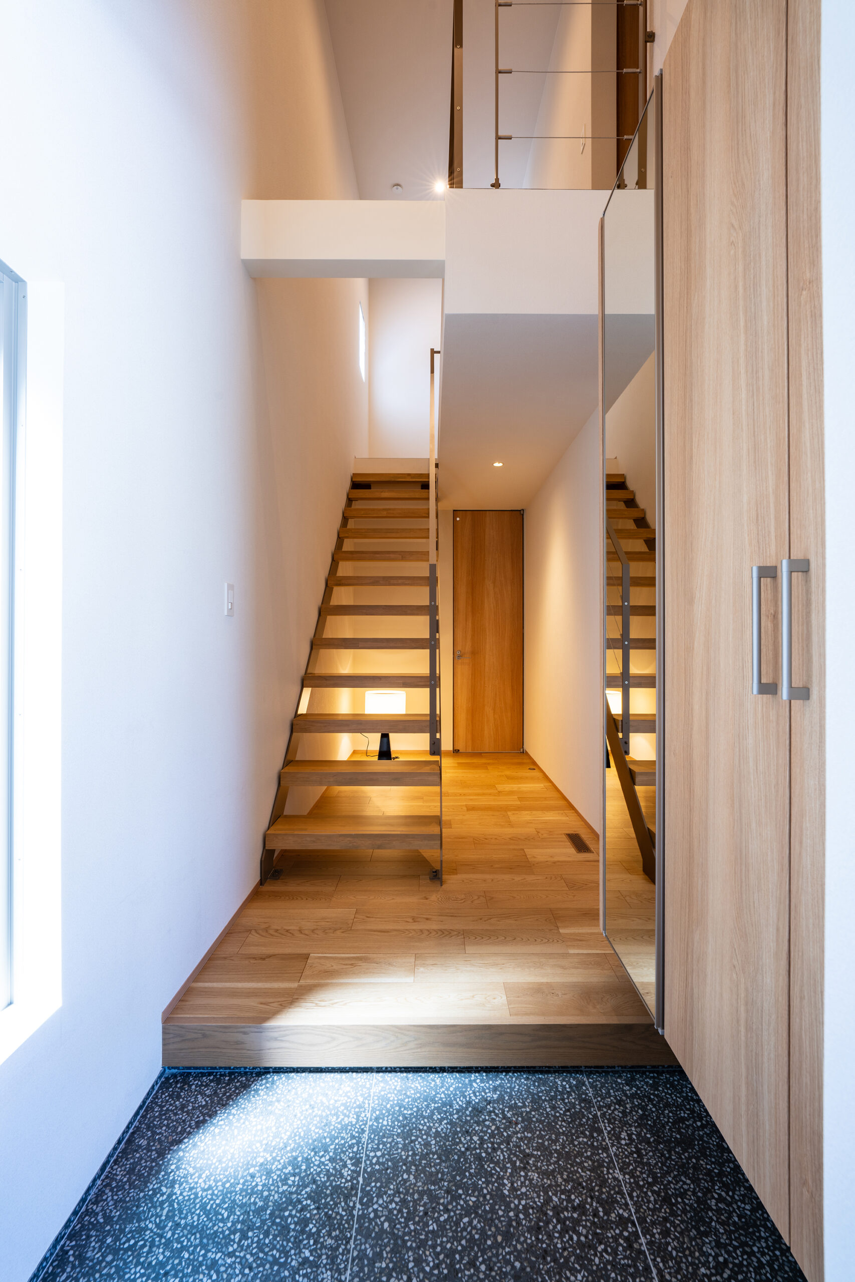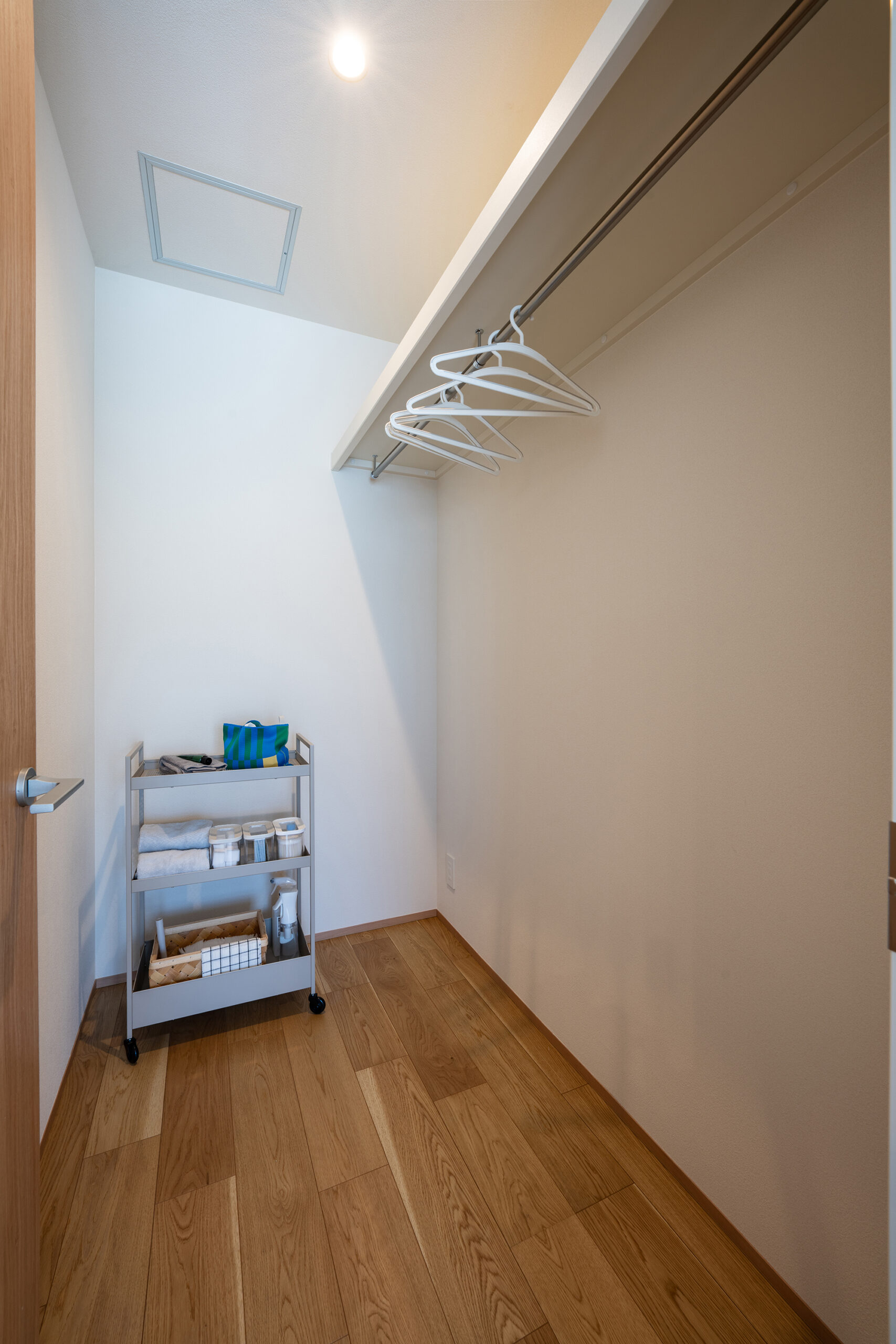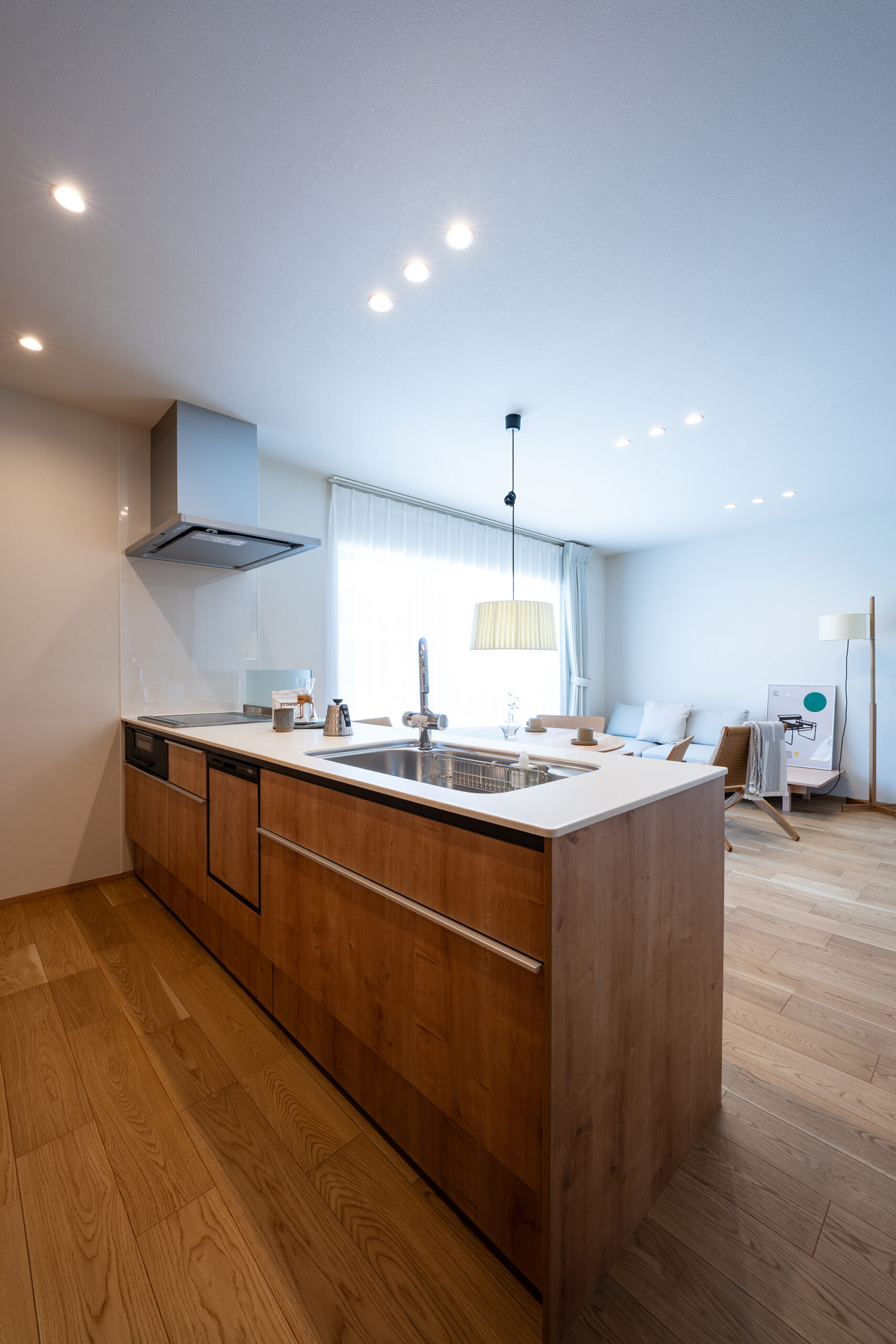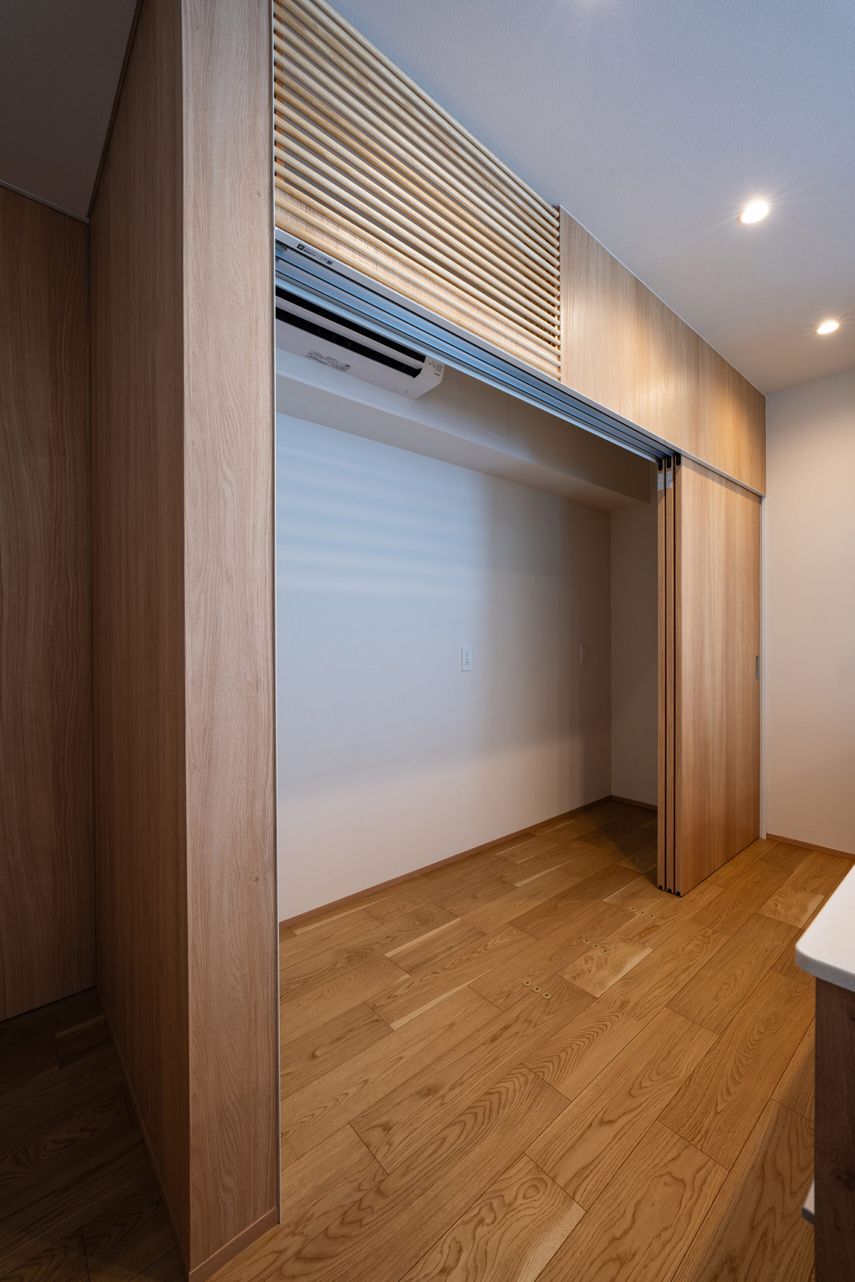 室内は生活に馴染みやすい、温かいオーク柄をベースデザインに、開放的で空間に広がりを感じさせる玄関の吹き抜けや生活感が出るエアコンや家電製品を隠しながらも、機能的に使うことができるよう設計。