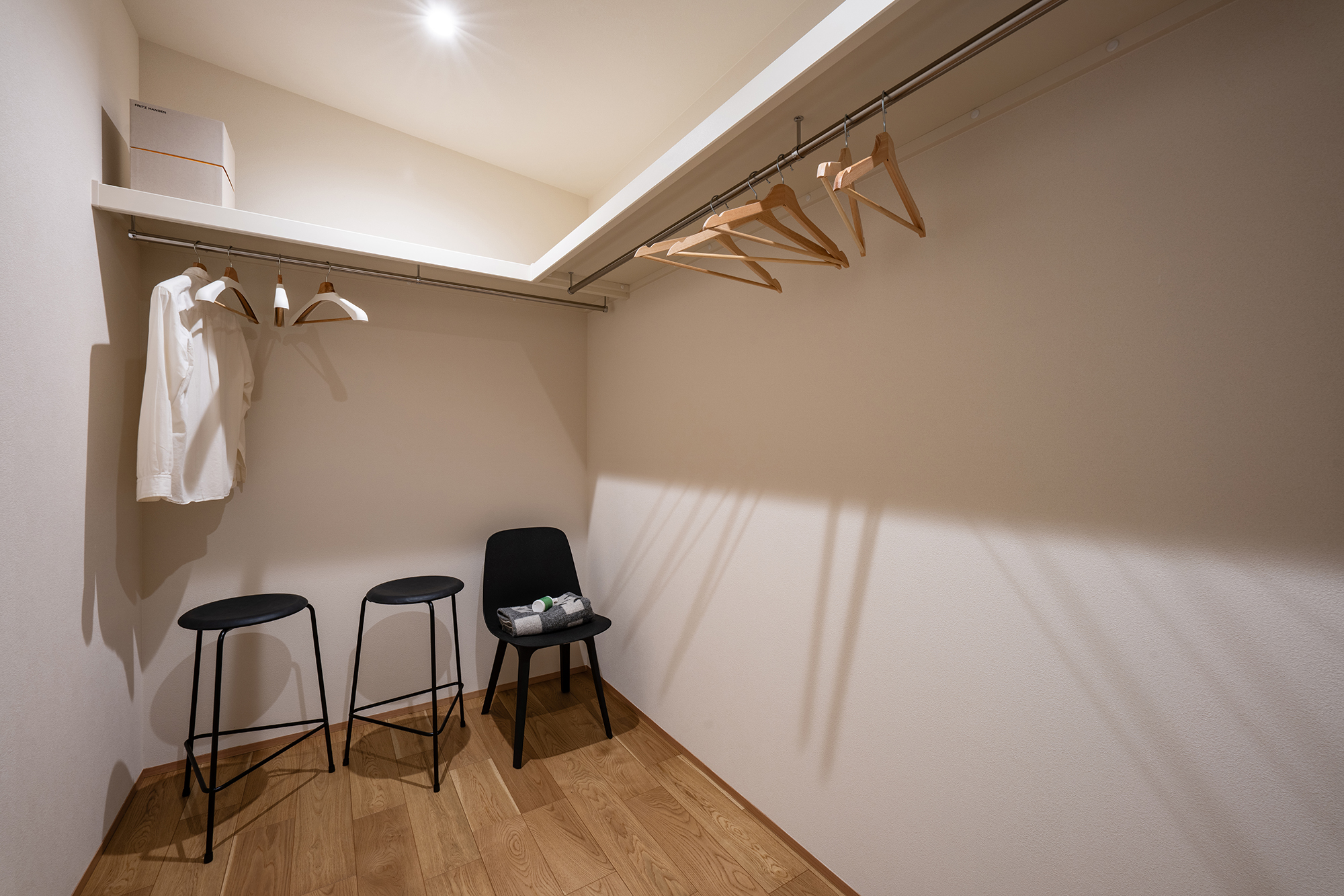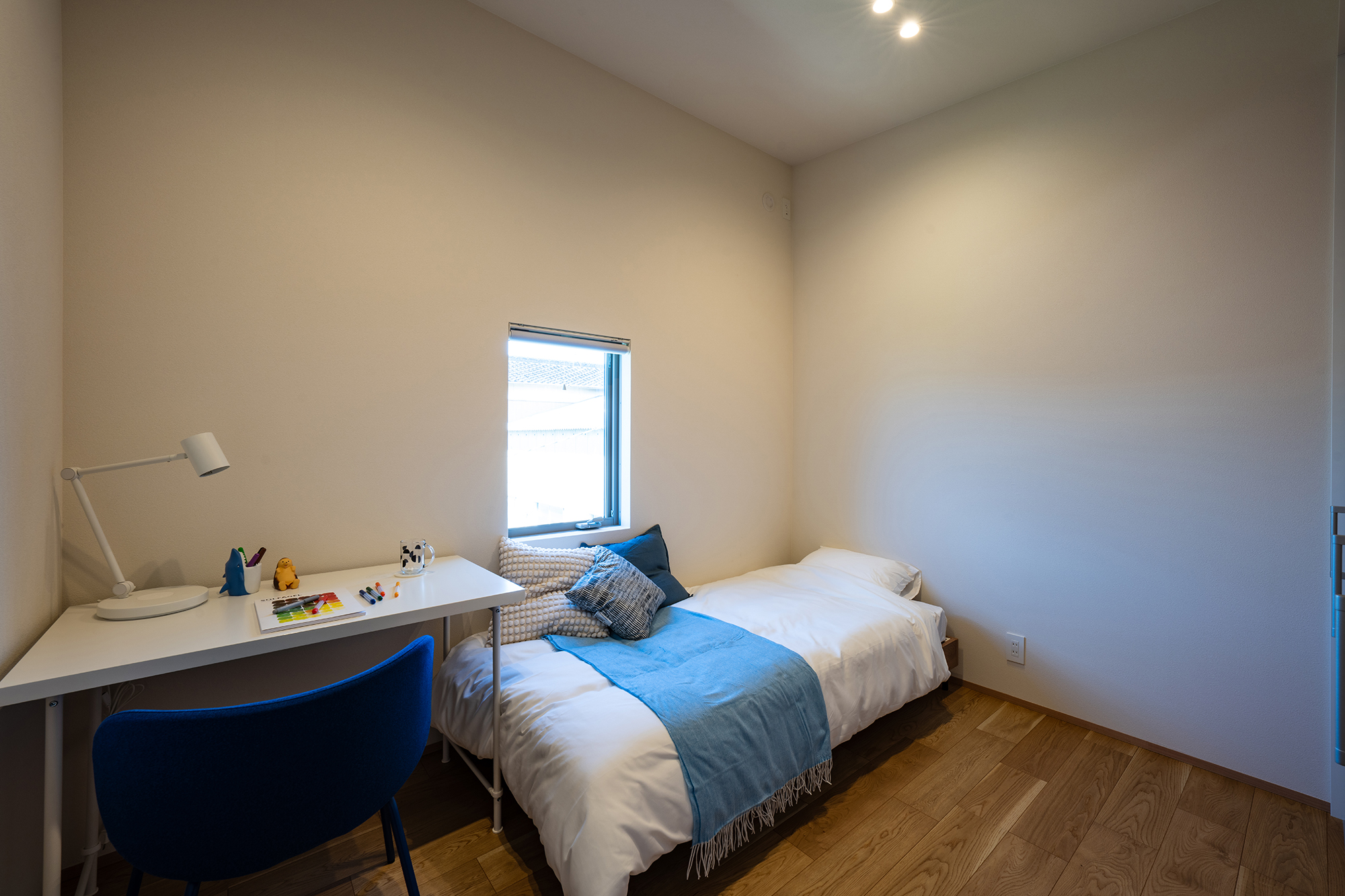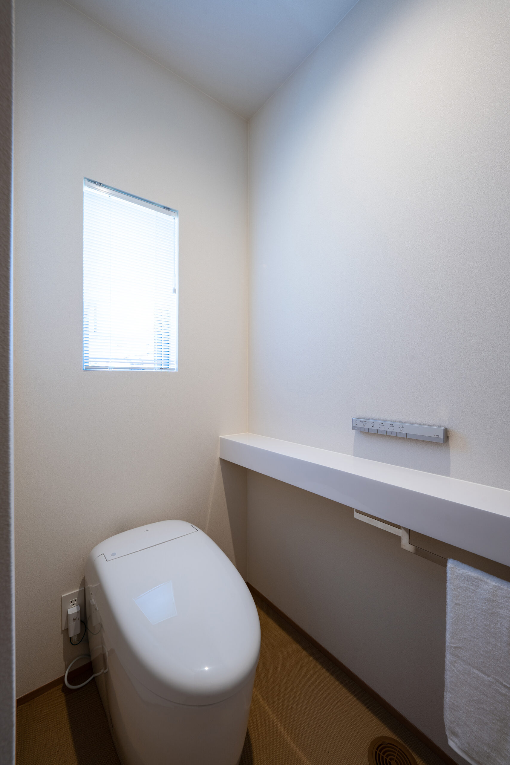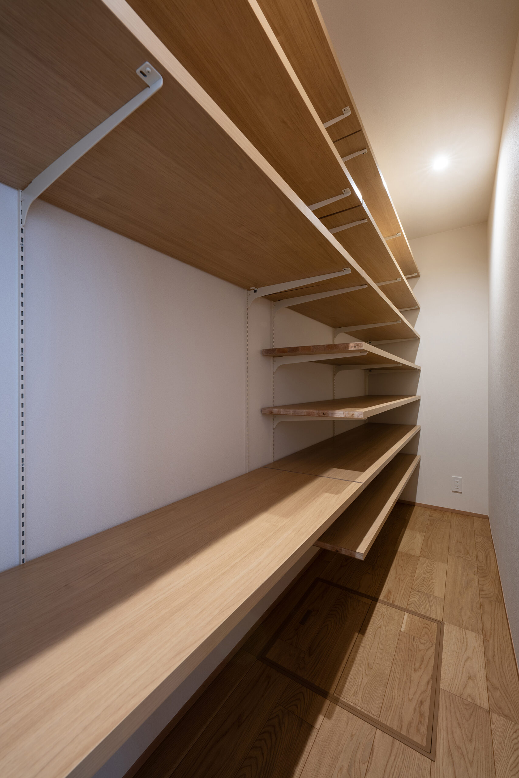 室内は生活に馴染みやすい、温かいオーク柄をベースデザインに、開放的で空間に広がりを感じさせる玄関の吹き抜けや生活感が出るエアコンや家電製品を隠しながらも、機能的に使うことができるよう設計。