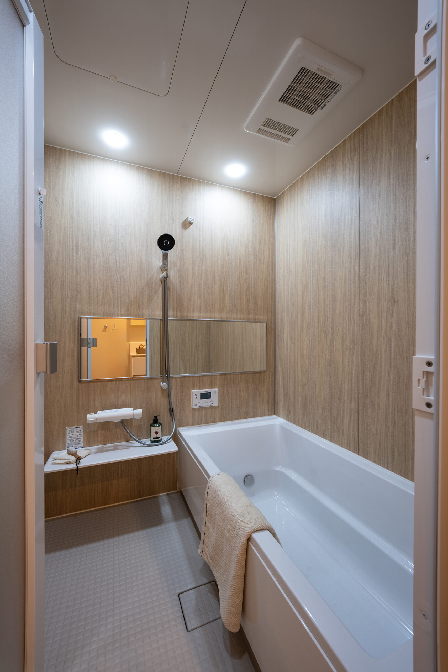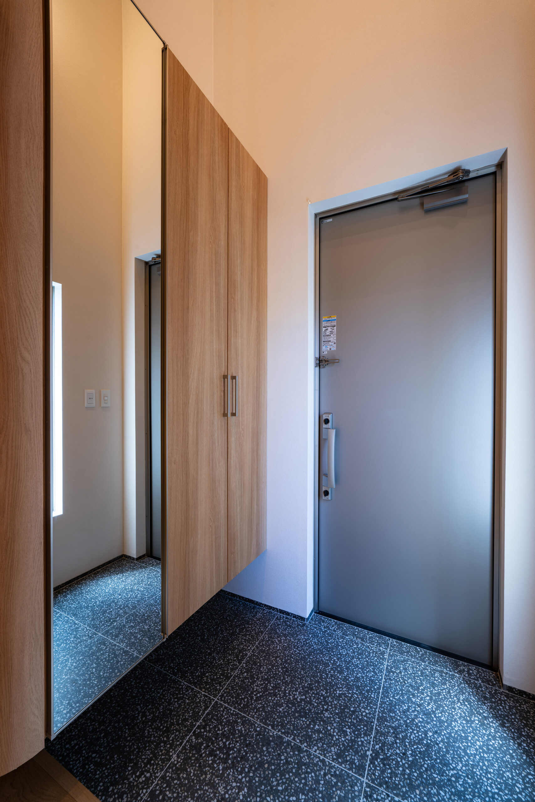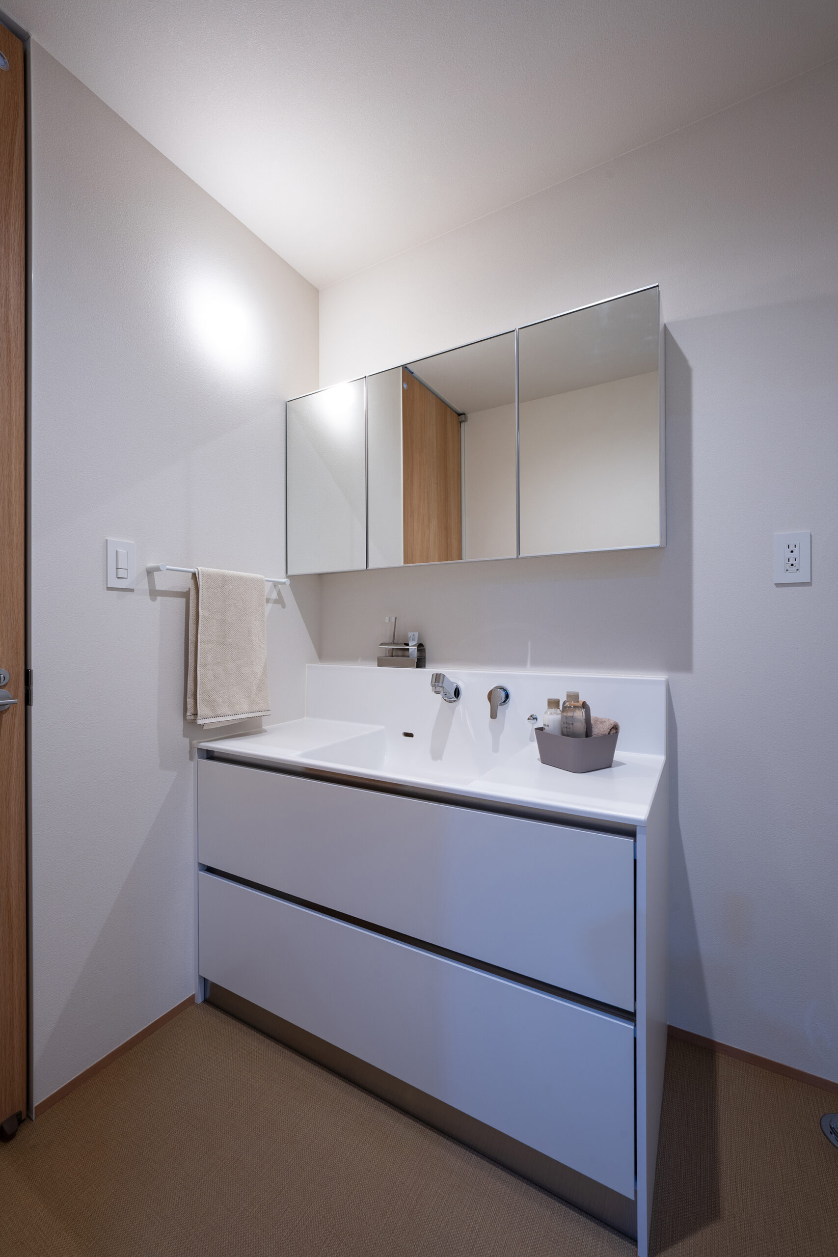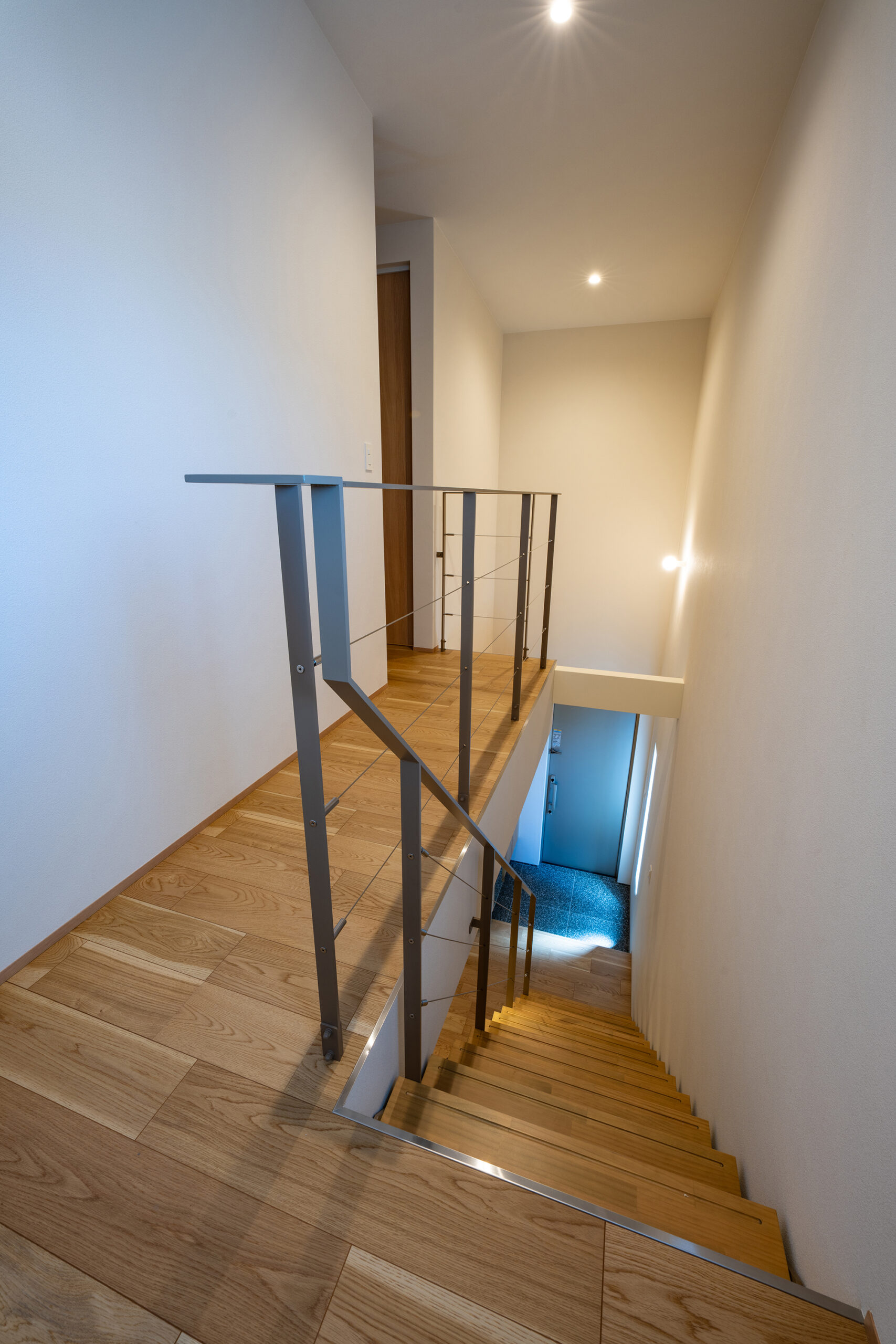 室内は生活に馴染みやすい、温かいオーク柄をベースデザインに、開放的で空間に広がりを感じさせる玄関の吹き抜けや生活感が出るエアコンや家電製品を隠しながらも、機能的に使うことができるよう設計。